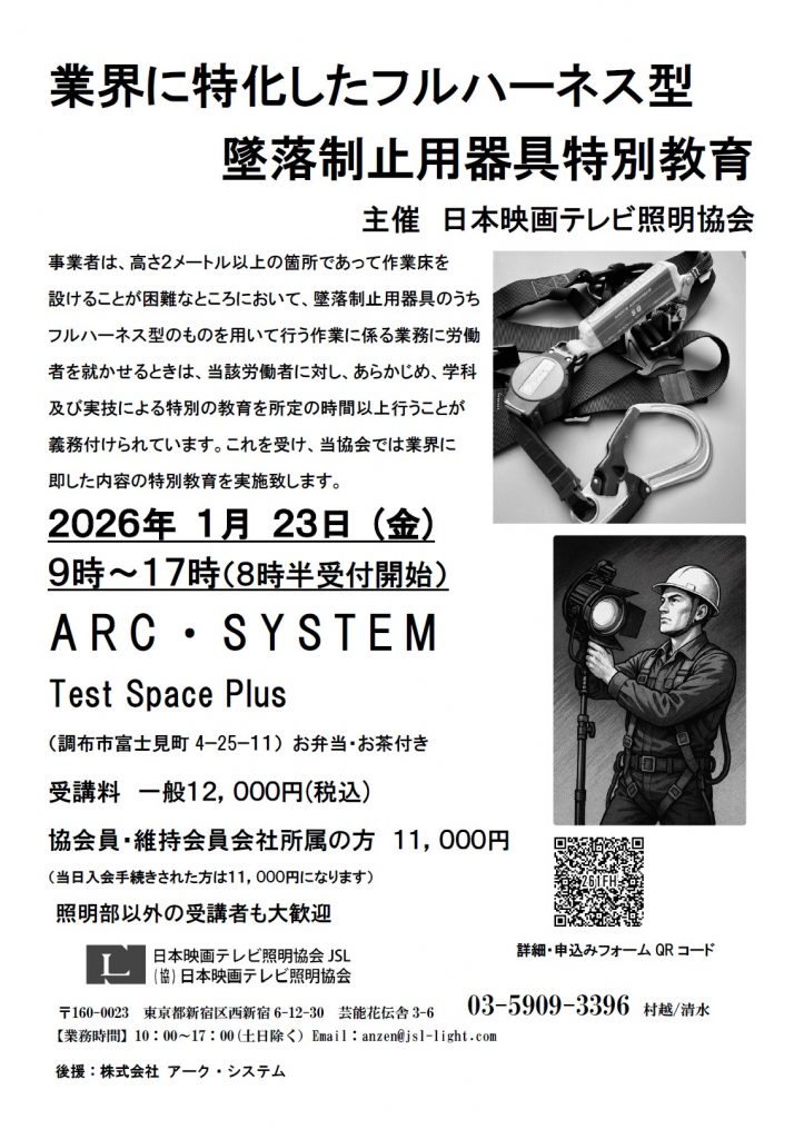 事業者は、高さ2メートル以上の箇所であって作業床を設けることが困難なところにおいて、墜落制止用器具のうちフルハーネス型のものを用いて行う作業に係る業務に労働者を就かせるときは、当該労働者に対し、あらかじめ、学科及び実技による特別の教育を所定の時間以上行うことが義務付けられています。これを受け、当協会では業界に即した内容の特別教育を実施致します。